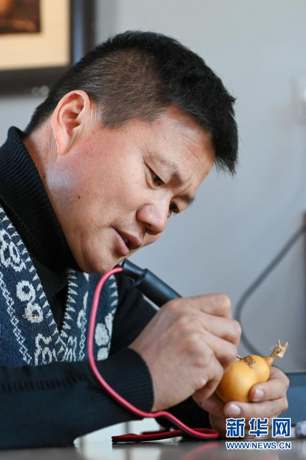 在霍爾果斯市加爾蘇村的烙畫工作室,曹光耀在創(chuàng)作葫蘆烙畫(2月6日攝)。新華社記者 丁磊 攝