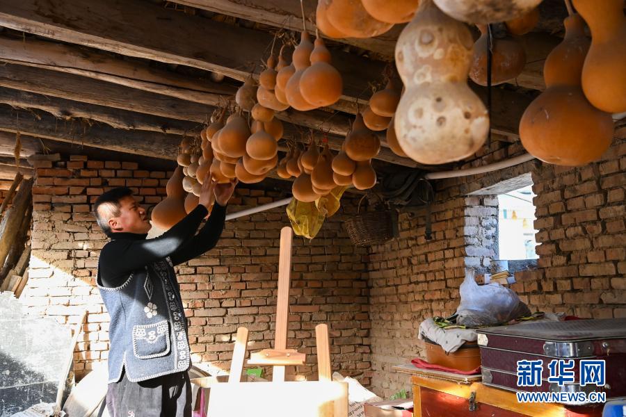 曹光耀在位于霍爾果斯市加爾蘇村的家中挑選葫蘆(2月6日攝)。新華社記者 丁磊 攝