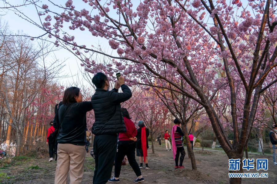 2月21日,人們在顧村公園福櫻林內自拍留影。