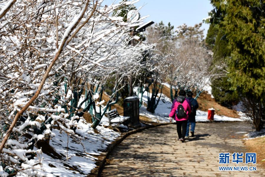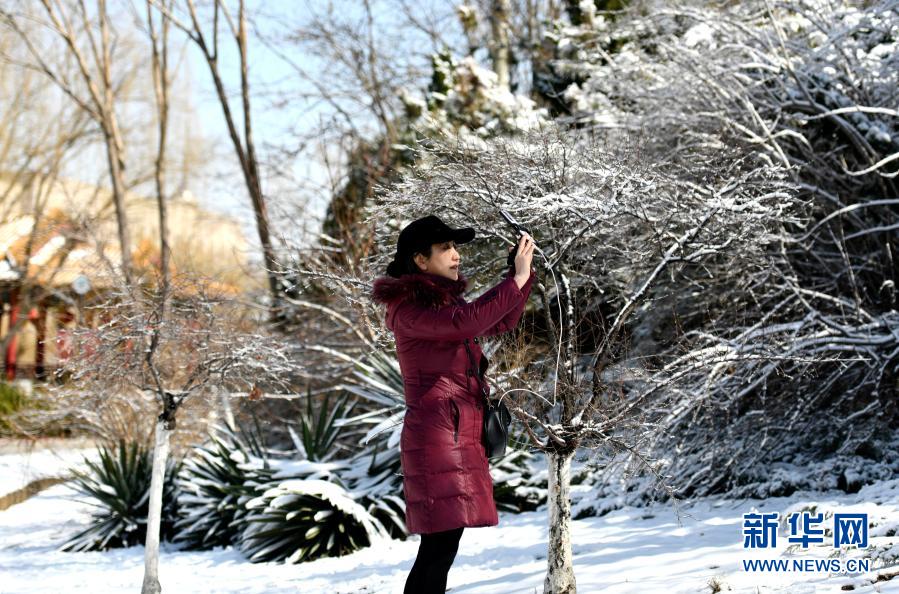 3月1日,市民在天津市南翠屏公園內拍攝雪景。