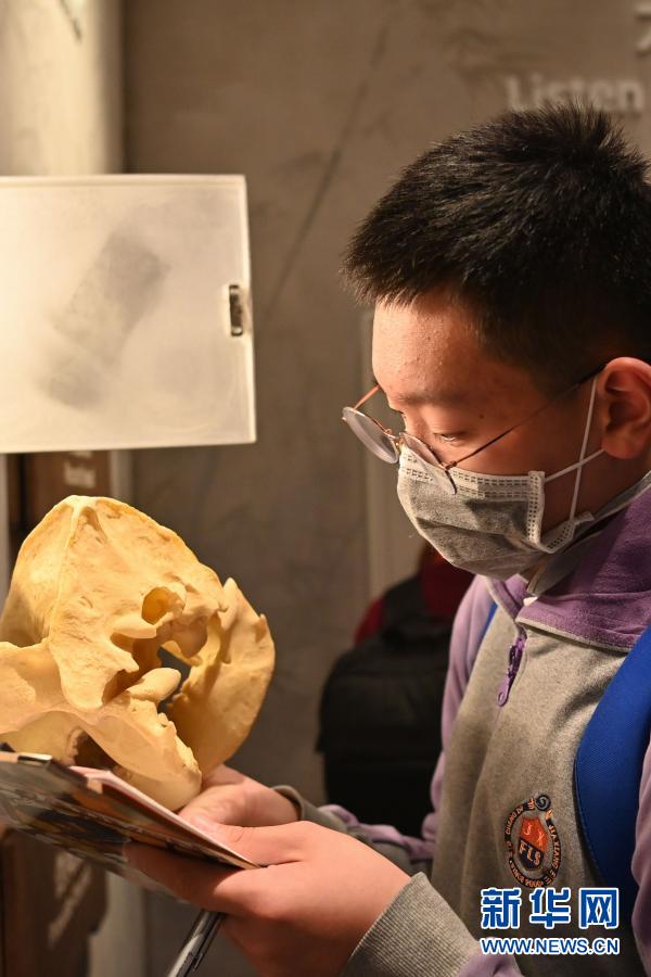 3月3日,在成都大熊貓博物館,一名學生在觀看大熊貓頭骨模型。新華社記者 胥冰潔 攝