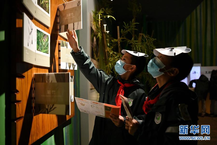 3月3日,在成都大熊貓博物館,學(xué)生通過展板了解熊貓飲食習(xí)慣。新華社記者 胥冰潔 攝