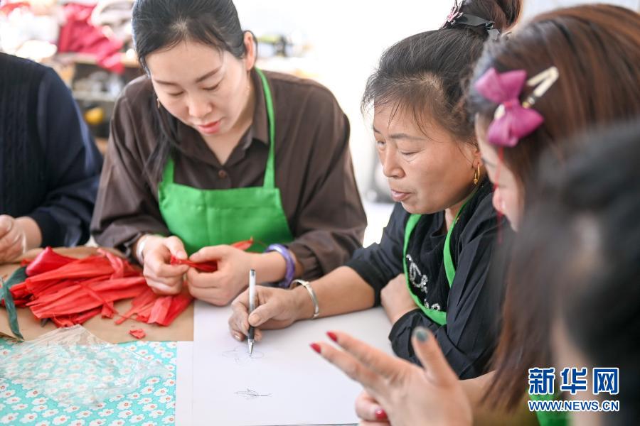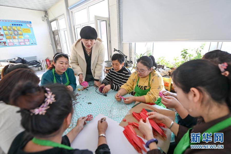3月2日,周艷文(站立者)在榆樹市巾幗草編合作社聯合社內帶領社員制作草編產品。新華社記者 顏麟蘊 攝