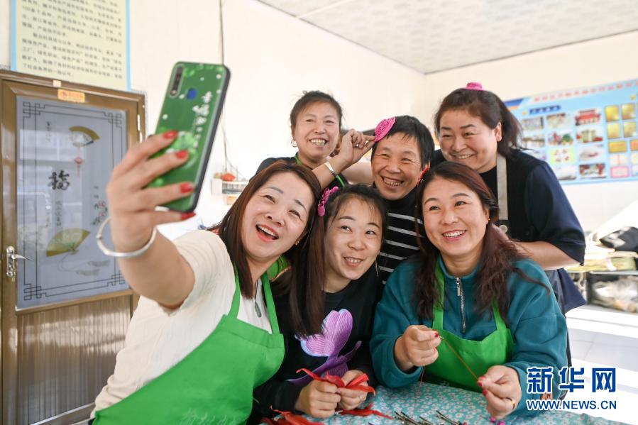 3月2日,榆樹市巾幗草編合作社聯合社的社員佩戴草編產品后自拍。新華社記者 顏麟蘊 攝