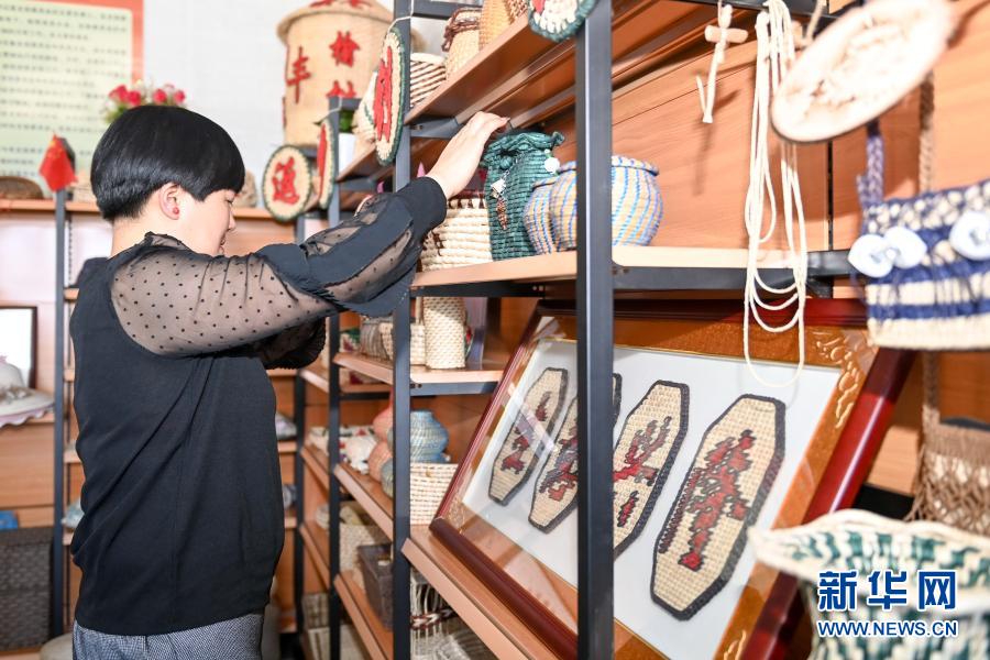 3月2日,周艷文在榆樹市巾幗草編合作社聯合社內整理草編手工藝品。新華社記者 顏麟蘊 攝