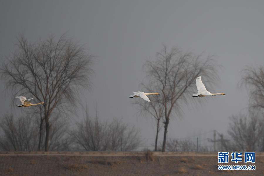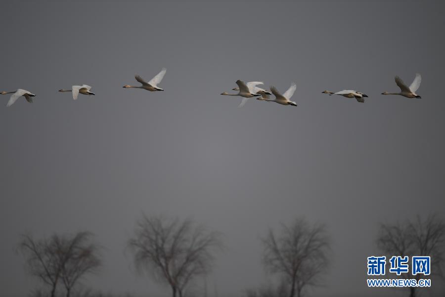 3月9日,候鳥在達拉特旗境內黃河濕地上空飛翔。