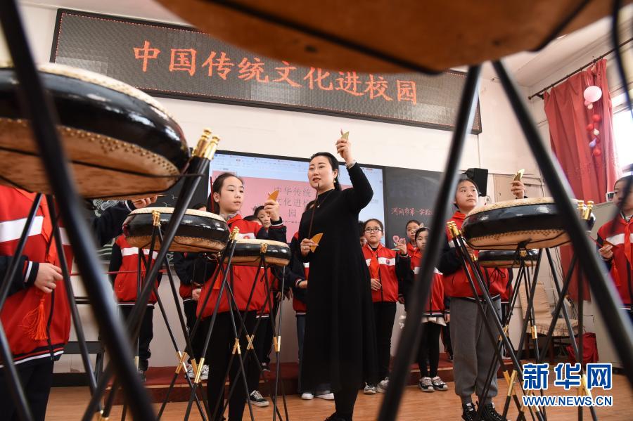 3月17日,西河大鼓藝人在河間市第一實(shí)驗(yàn)小學(xué)指導(dǎo)學(xué)生練習(xí)西河大鼓。