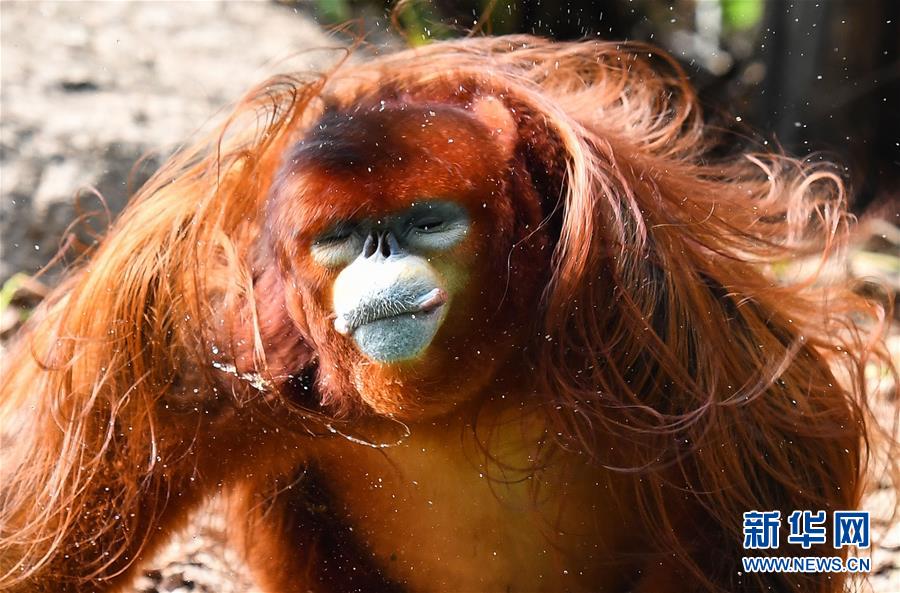 3月17日,川金絲猴猴爸“平平”喝水后甩動一頭金黃秀發。 新華社記者 劉大偉 攝