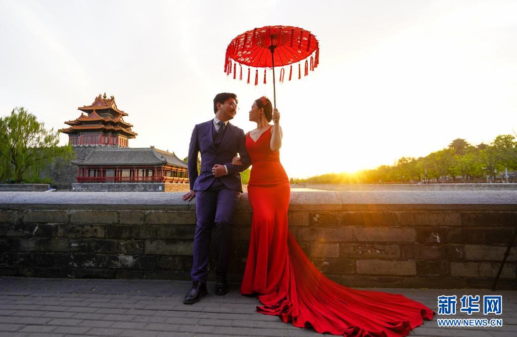 4月12日,一對新人在夕陽下的故宮角樓附近拍攝婚紗照。