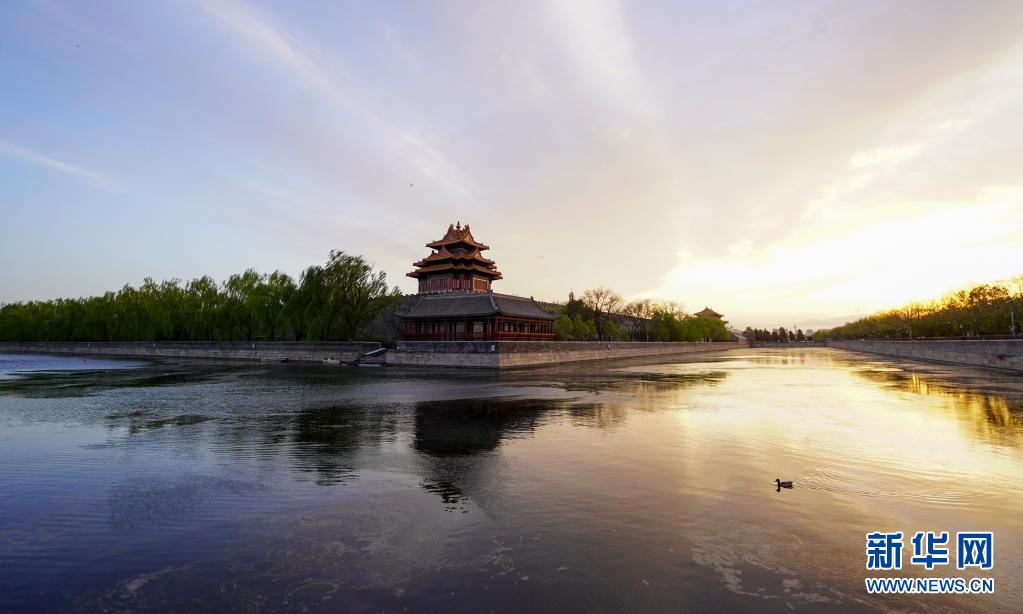 這是4月12日拍攝的夕陽下的故宮角樓。