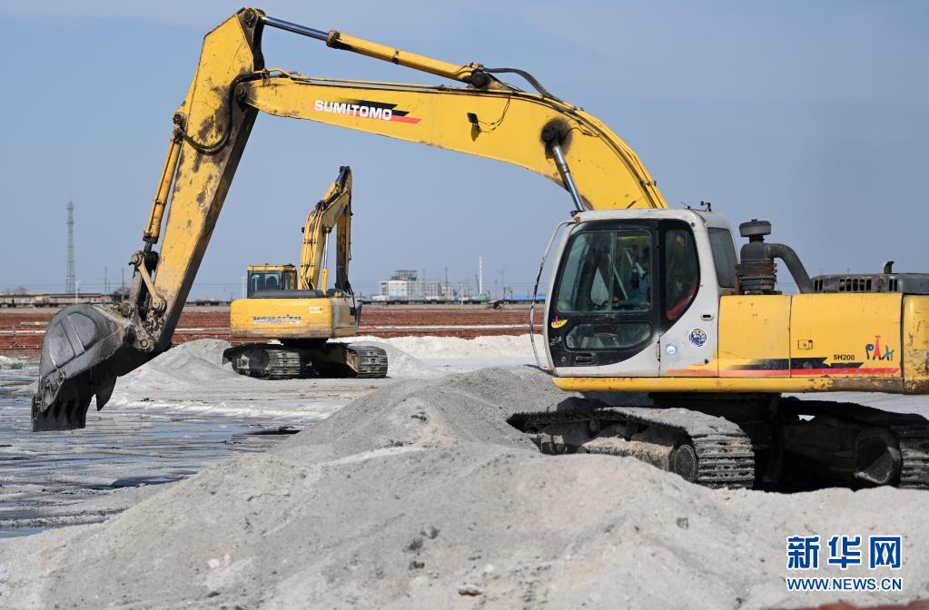 4月13日,大型機械在天津長蘆漢沽鹽場的鹽池中作業。