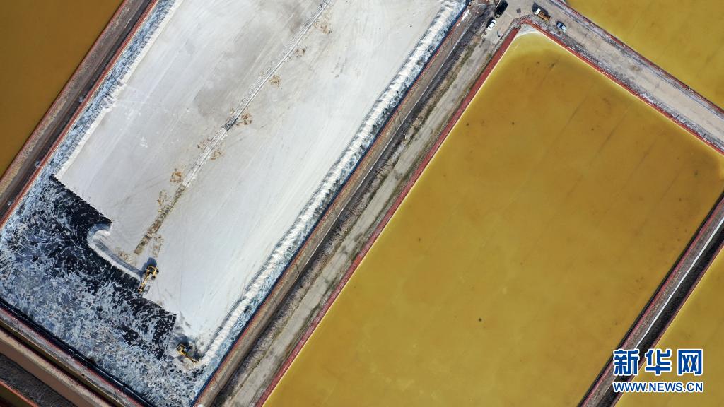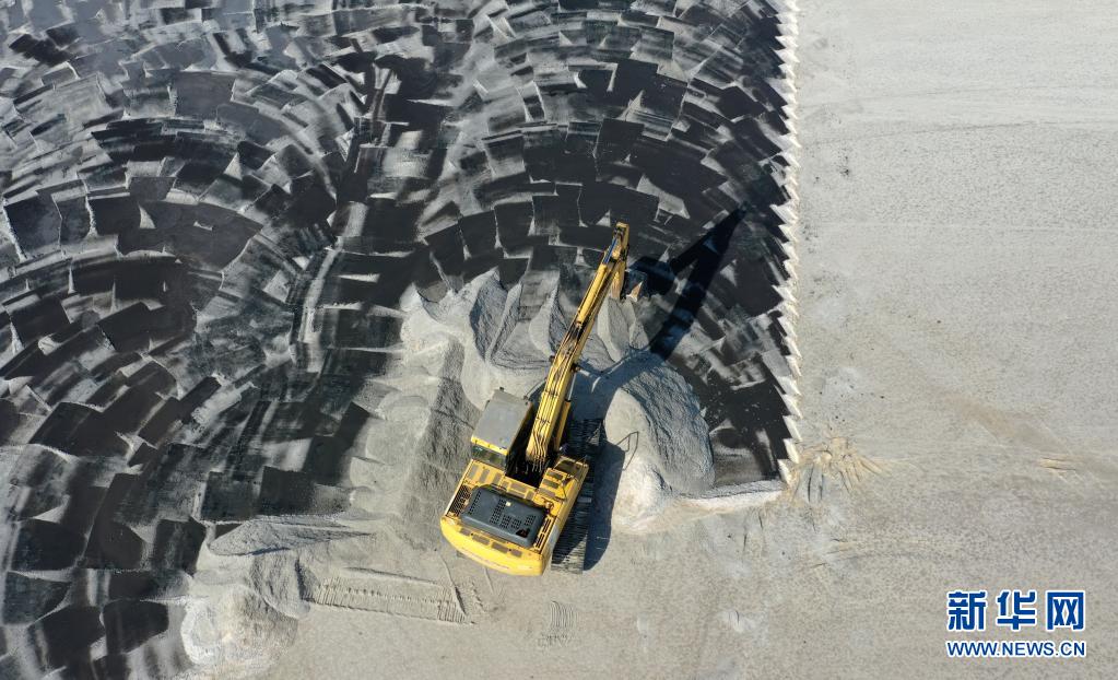 4月13日,大型機械在天津長蘆漢沽鹽場的鹽池中作業(無人機照片)。