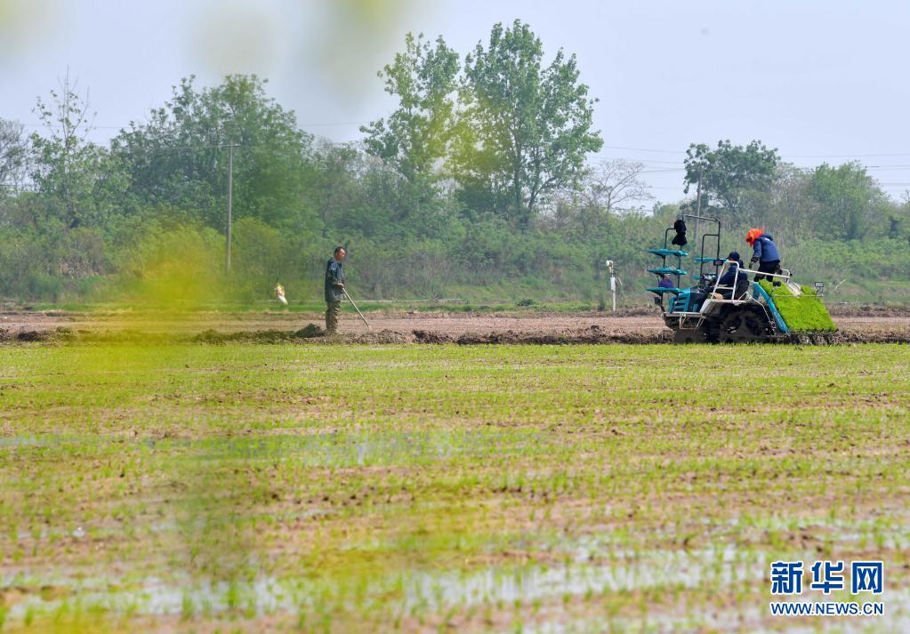 4月13日,在江西省南昌縣蔣巷鎮,當地農戶在田間進行插秧作業。