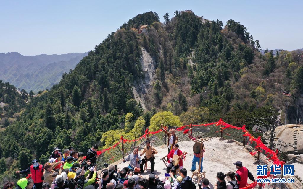 華山景區(qū)西峰索道“華陰老腔團”在華山西峰之巔為游客表演(5月5日攝,無人機照片)。