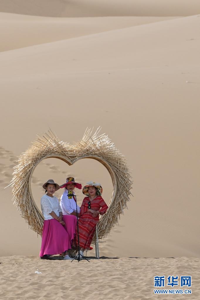 游客在新疆鄯善縣庫木塔格沙漠風景區留影(5月15日攝)。