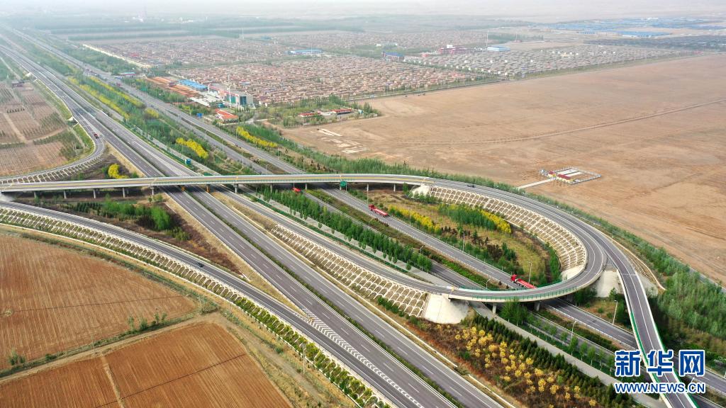 這是福銀高速延伸段寧夏銀川市永寧縣閩寧鎮(zhèn)路段和閩寧鎮(zhèn)(4月26日攝,無(wú)人機(jī)照片)。新華社記者 王鵬 攝