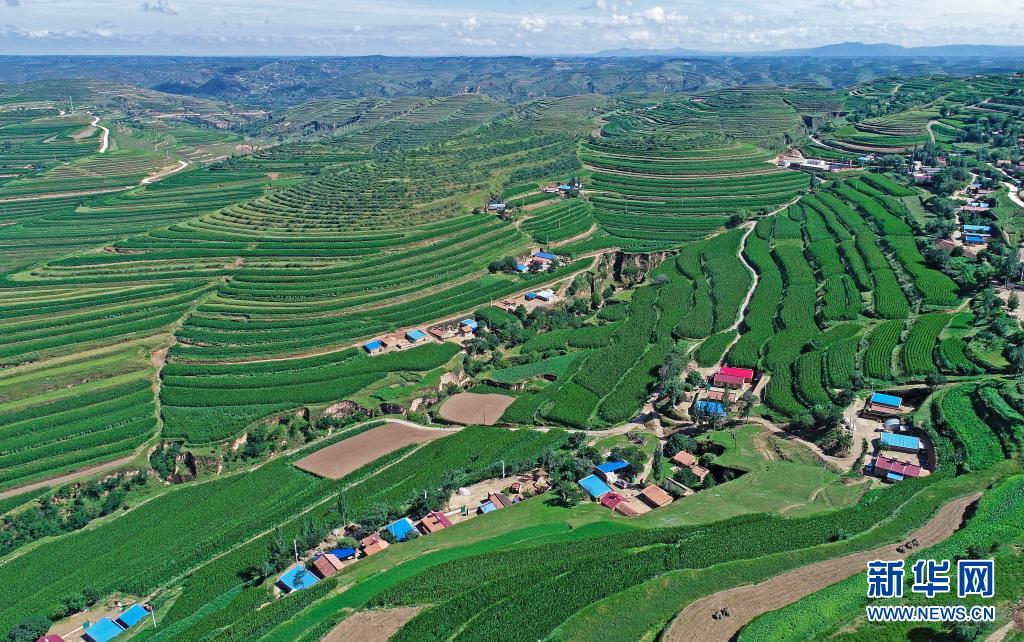 寧夏固原市彭陽縣的梯田景觀(2018年7月16日攝,無人機照片)。新華社記者 王鵬 攝