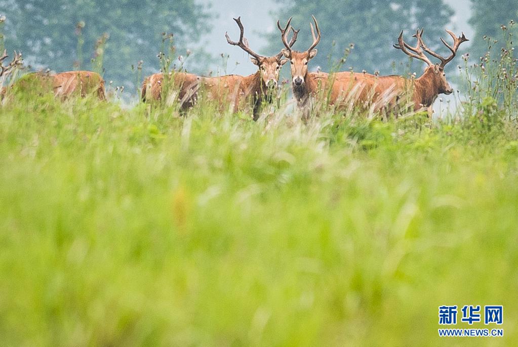 5月17日,麋鹿在石首麋鹿國家級自然保護區內活動。新華社記者 饒饒 攝