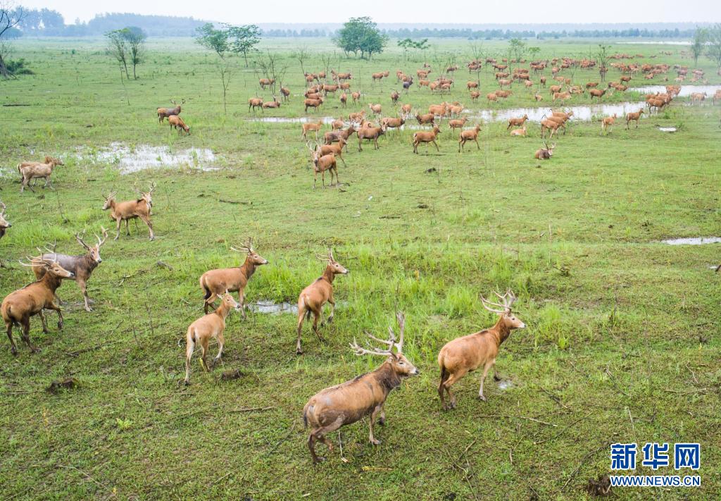 5月17日,麋鹿在石首麋鹿國家級自然保護區內活動(無人機照片)。新華社記者 肖藝九 攝
