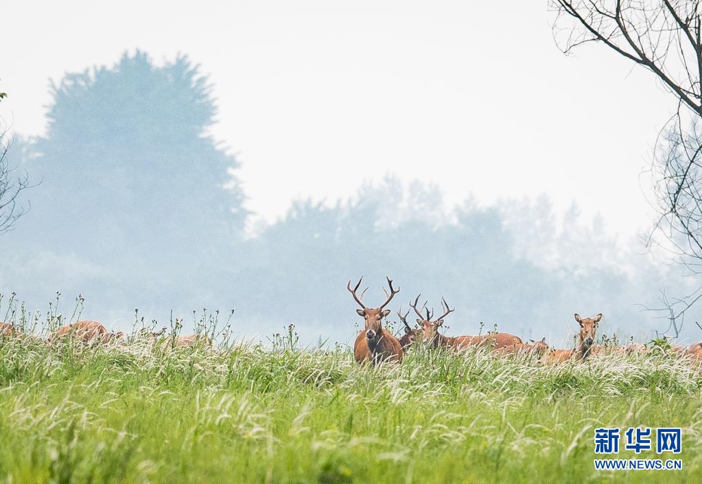 5月17日,一群麋鹿在石首麋鹿國家級(jí)自然保護(hù)區(qū)內(nèi)活動(dòng)。新華社記者 肖藝九 攝