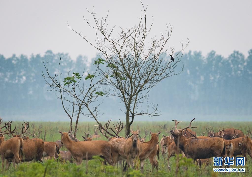 5月17日,一群麋鹿在石首麋鹿國(guó)家級(jí)自然保護(hù)區(qū)內(nèi)活動(dòng)。新華社記者 肖藝九 攝
