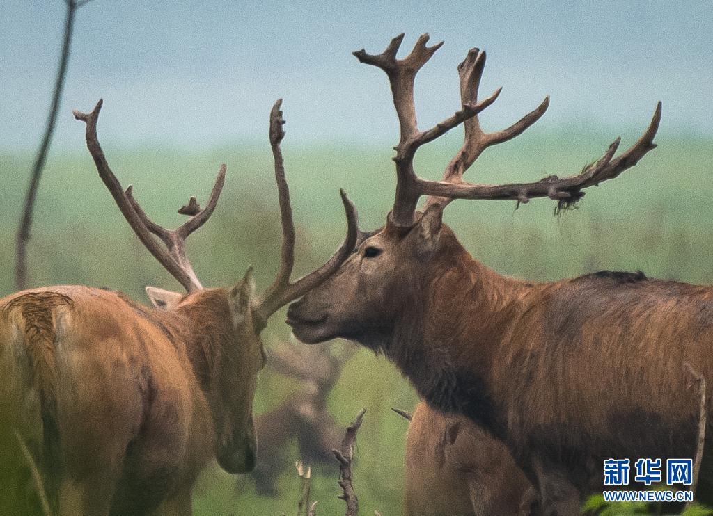 5月17日,麋鹿在石首麋鹿國家級自然保護區(qū)內(nèi)活動。新華社記者 饒饒 攝