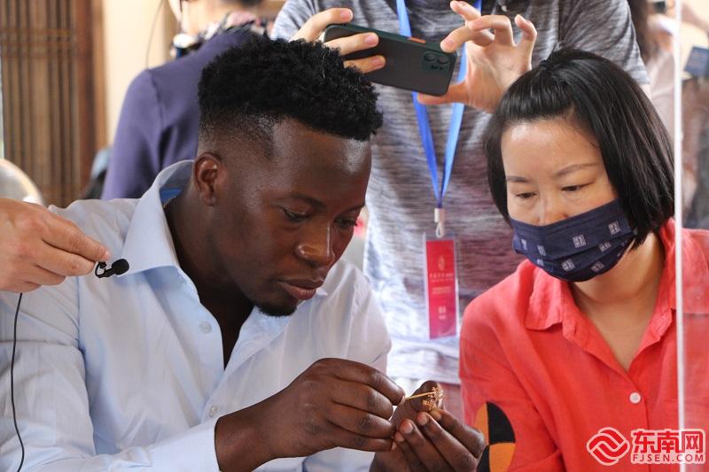 在新店古城遺址,參訪團成員親身體驗了福州軟木畫的制作。軟木畫主要用栓樹皮經過精雕細刻藝術加工,構成各種浮雕式、立體的山水、花鳥、亭臺樓閣等風景畫,來自加納的羅伯特·那尼在老師的指導下,認真地做起軟木畫的樹木。“非常了不起的藝術品,雖然很累,但很有成就感。” 羅伯特表示,軟木畫零部件十分精細, 木片好小,又輕又軟,要把握好力道,創作過程中要很有耐心和毅力,很佩服手工藝人對傳統技藝的堅守和傳承。