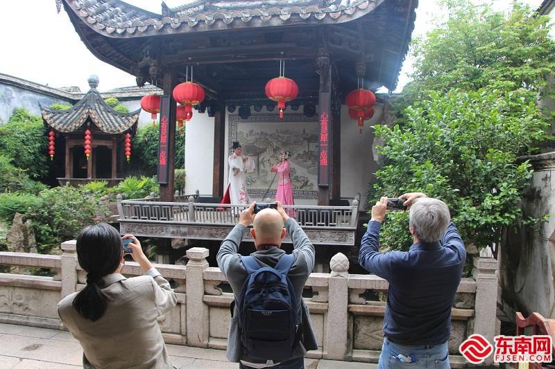 白墻瓦屋,石板小路……在工作人員的帶領下,參訪團一行走街串巷,先后參觀了嚴復故居和水榭戲臺,還觀看了一場精彩的閩劇表演。在庭院內,精致的木雕,馬鞍形的風火墻,獨具閩都特色的歷史文化建筑,讓不少第一次到福州的參訪團成員感到震撼,來自加拿大的網絡名人柯克·阿佩蘭被三坊七巷古色古香的建筑吸引,并對閩劇產生了濃厚的興趣,不時拿起手中的攝像設備拍下所見所聞,表演結束后還上臺和閩劇演員們進行合影。