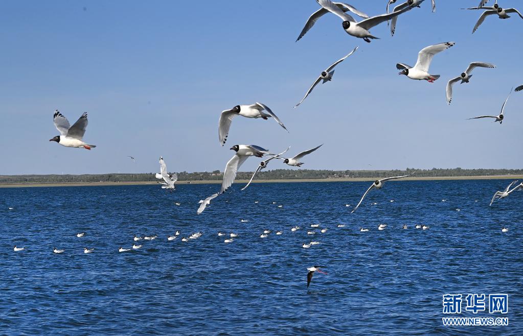 遺鷗在紅堿淖湖面上飛翔(6月2日攝)。