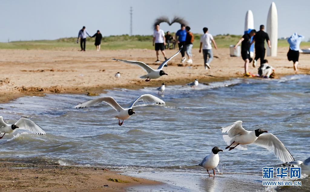 6月2日,游人在紅堿淖景區游玩,遺鷗在一旁相伴。