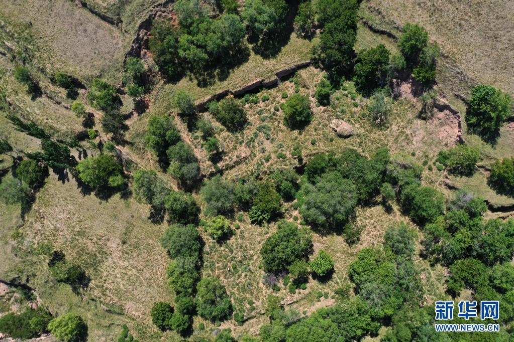 寧夏固原市西吉縣沙溝鄉陽莊村上圈組,昔日村民生活的遺跡被綠色覆蓋(無人機照片,2020年6月2日攝)。新華社記者 王鵬 攝