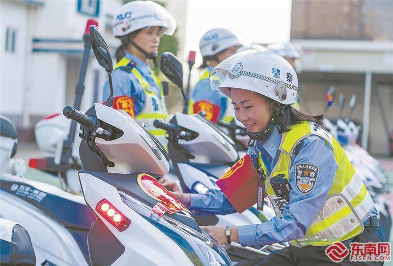 6日,霞浦縣公安局騎警中隊的20多名男女騎警,在給警用摩托車貼上“愛心護考車”字樣,為第二天開考的高考考生提供服務。鄭培鑾 攝
