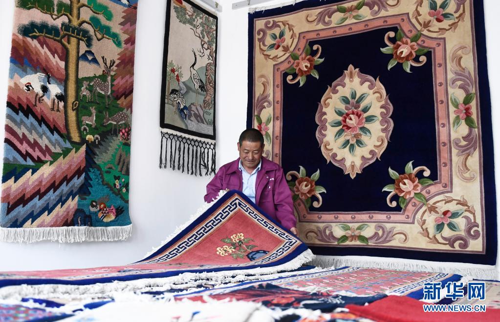 6月5日,在西寧市湟中縣上新莊鎮加牙村,楊永良在整理制作好的藏毯。