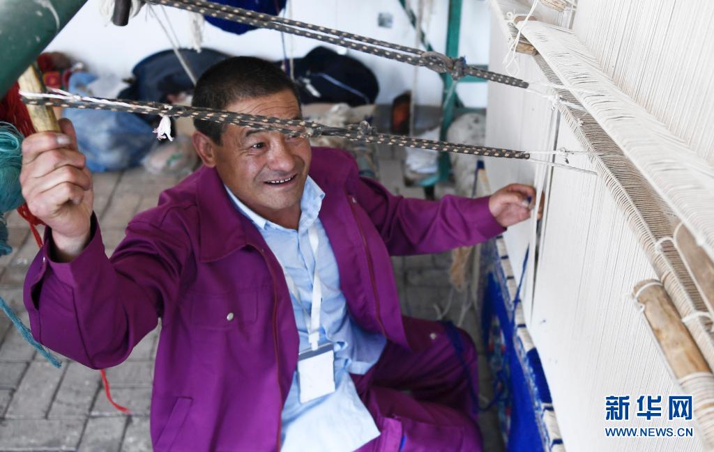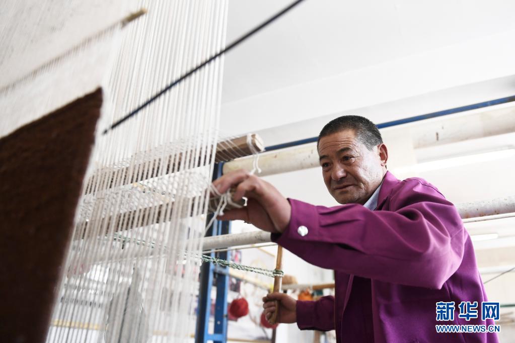 6月5日,在西寧市湟中縣上新莊鎮加牙村,楊永良在制作藏毯。