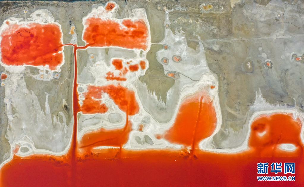 近日,隨著氣溫不斷升高,山西運城鹽湖呈現(xiàn)五彩斑斕的景象。