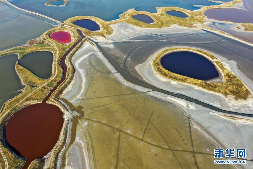 近日,隨著氣溫不斷升高,山西運城鹽湖呈現五彩斑斕的景象。