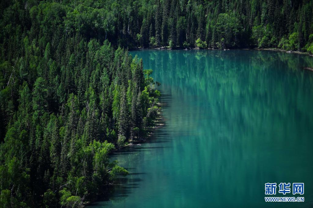 6月10日拍攝的新疆阿勒泰地區喀納斯景區臥龍灣景色(無人機照片)。