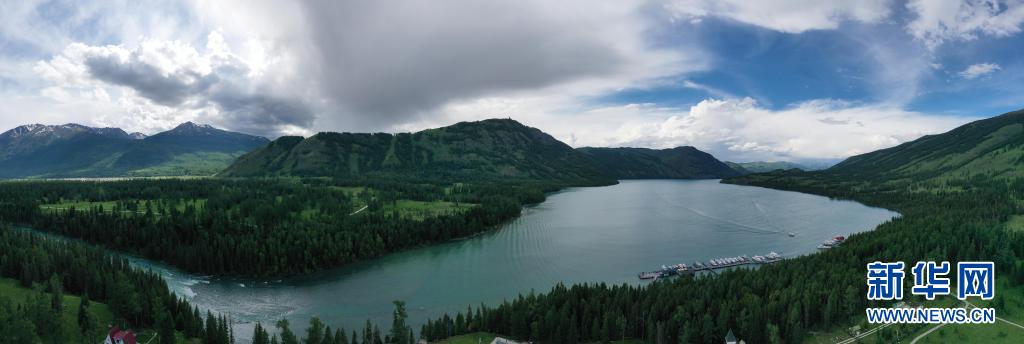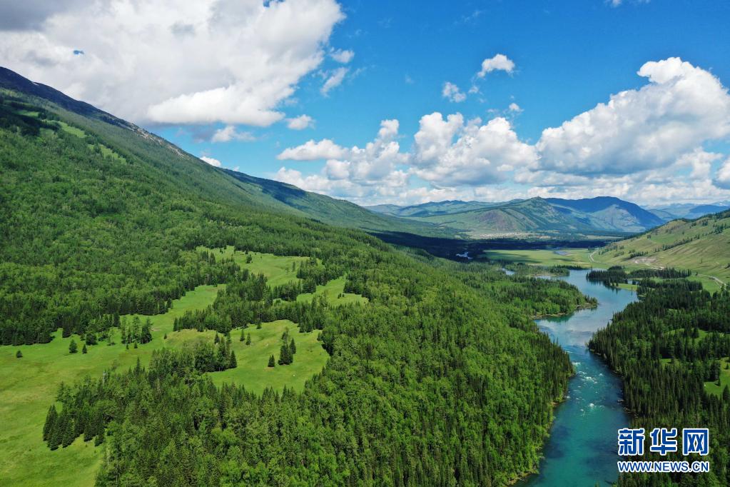 6月10日拍攝的新疆阿勒泰地區喀納斯景區景色(無人機照片)。