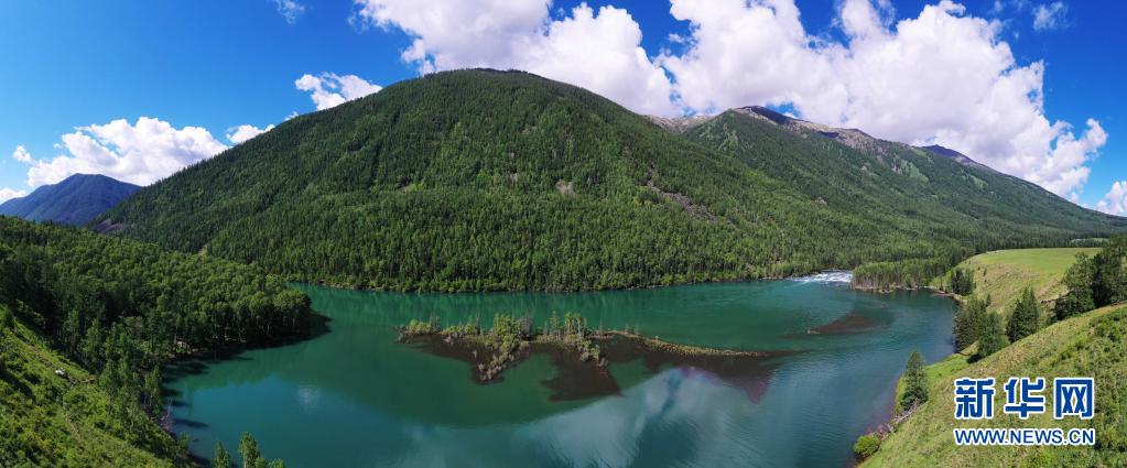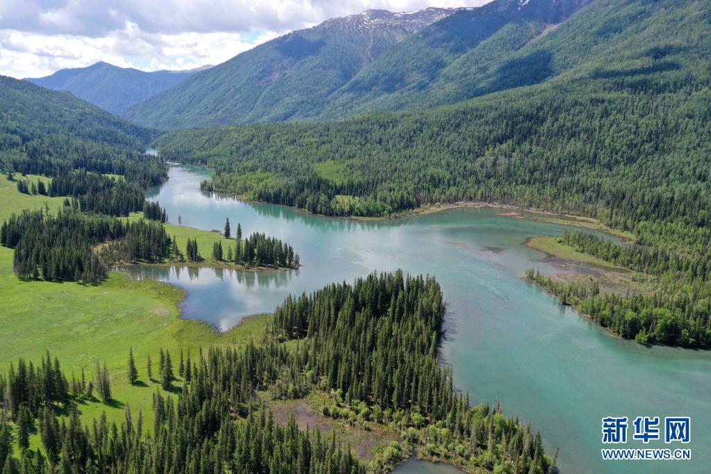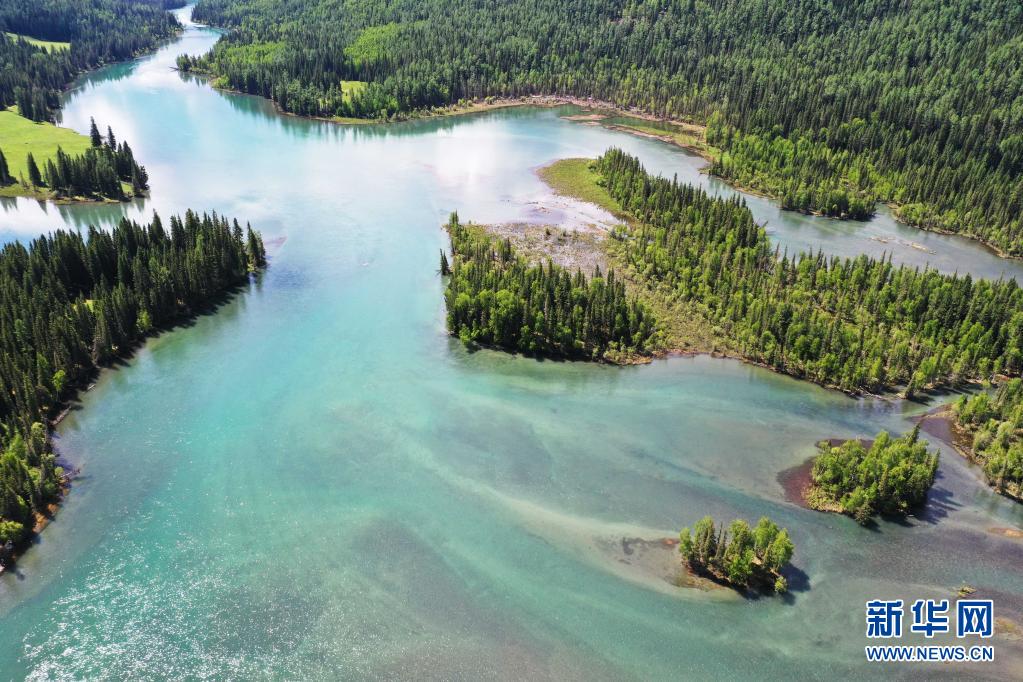 6月10日拍攝的新疆阿勒泰地區喀納斯景區神仙灣景色(無人機照片)。