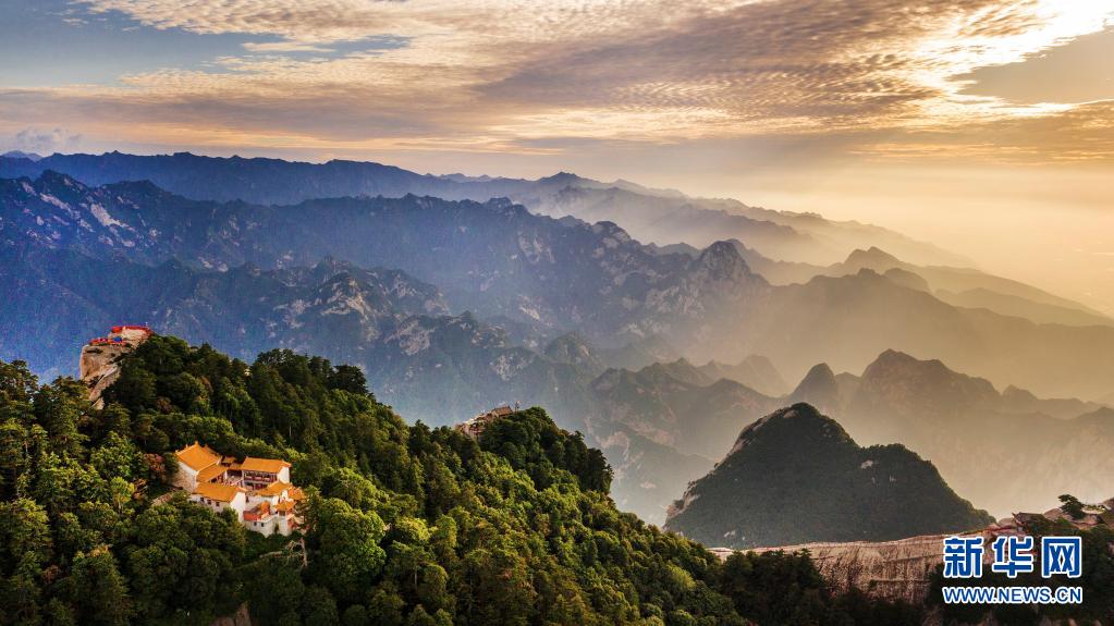 雨后初霽,位于陜西省華陰市的西岳華山在晚霞映照下,風光壯美。