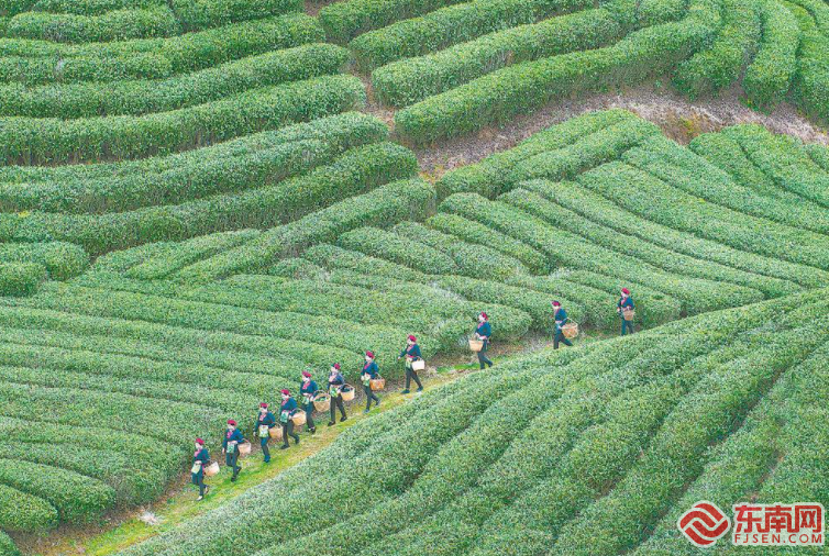 近日,霞浦縣水門鄉茶崗村在拍攝鄉村振興電視節目時,畬族同胞身著盛裝上山采茶。