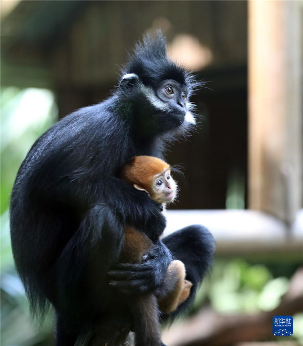 8月26日,黑葉猴寶寶“大象”與三歲的姐姐“端午”在一起。