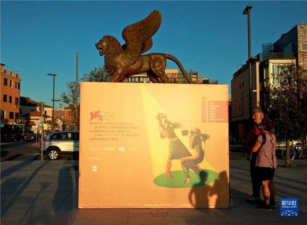 9月1日,在意大利威尼斯利多島,人們閱讀第78屆威尼斯國際電影節(jié)的海報(bào)。