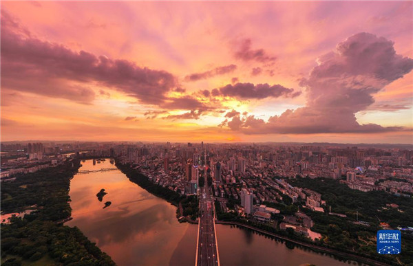 9月5日,陣雨過后,美麗晚霞映照南寧上空(無人機照片)。