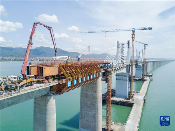 9月6日,大型機械在新建福廈鐵路湄洲灣跨海大橋移動模架澆筑混凝土(無人機照片)。
