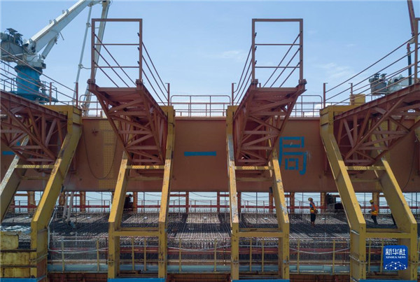 9月6日,中鐵十一局工人在新建福廈鐵路湄洲灣跨海大橋移動模架內作業(無人機照片)。