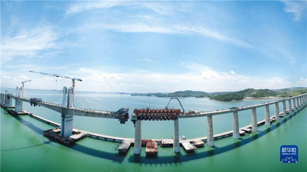 這是新建福廈鐵路湄洲灣跨海大橋最后一孔移動模架現(xiàn)澆梁澆筑作業(yè)現(xiàn)場,跨海大橋即將合龍(無人機(jī)全景照片,9月6日攝)。