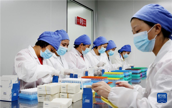 9月6日,工作人員在進行聯檢試劑盒的包裝。