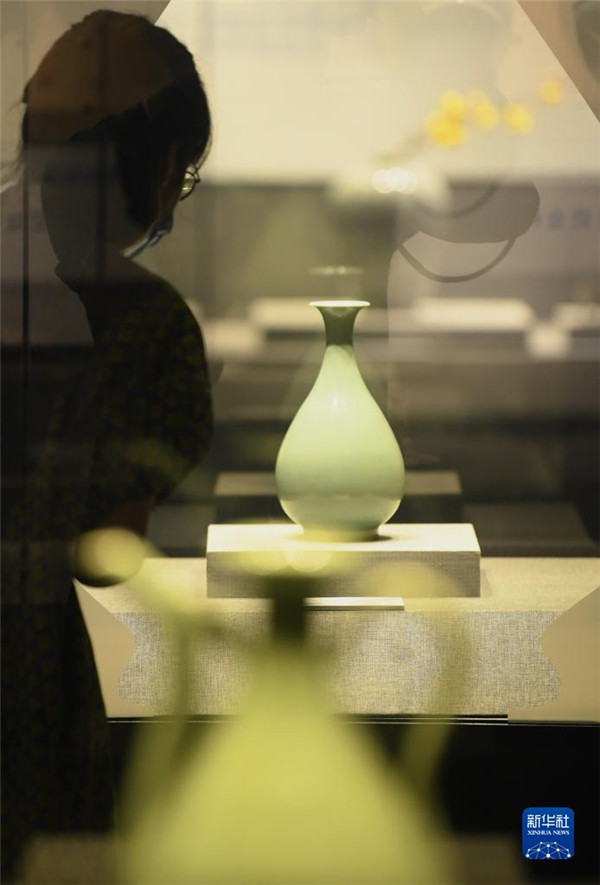 9月14日,觀眾在觀看浙江泰順縣文博館館藏的國家一級文物元龍泉青瓷玉壺春瓶。
