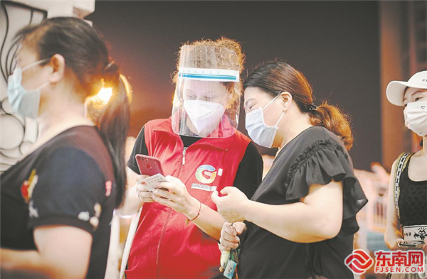 14日,在廈門思明區(qū)筼筜街道官任社區(qū)的一處核酸檢測點,社區(qū)外籍主任助理——捷克女孩潘淑娜在指導居民用手機預登記。福建日報記者 施辰靜 攝